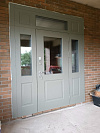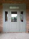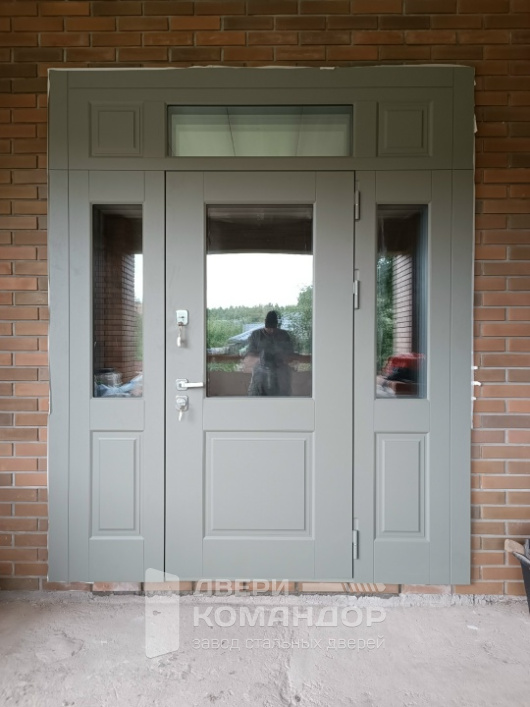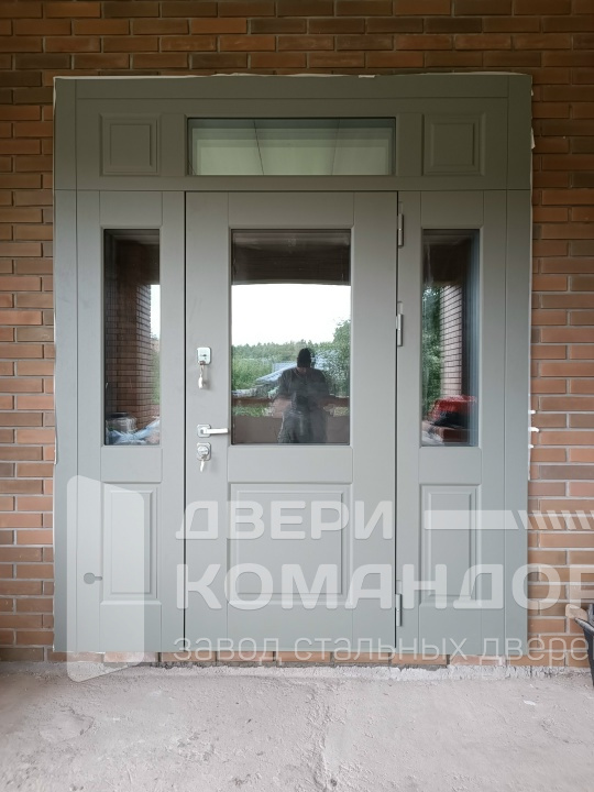 Эта уличная дверь для частного дома создаёт солидный входной портал: глухое полотно с филёнками, по бокам узкие остеклённые вставки и сверху светопрозрачная фрамуга — в прихожей становится светлее без компромиссов по безопасности. Терморазрыв разрывает мост холода и помогает удерживать тепло зимой и прохладу летом. Снаружи и внутри — МДФ-накладки с аккуратной фрезеровкой: покрытие стойко к истиранию и случайным царапинам, не выгорает и легко моется. Закалённые стеклопакеты в створке и фрамугах визуально облегчают массив и позволяют видеть гостей. Двойное запирание с раздельной фурнитурой и мощные петли добавляют уверенности в ежедневной эксплуатации. Изготавливаем под проём и стиль вашего фасада — от цвета до рисунка панелей.