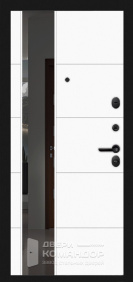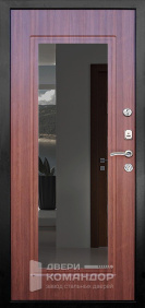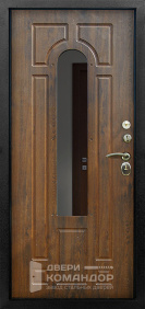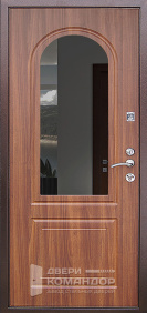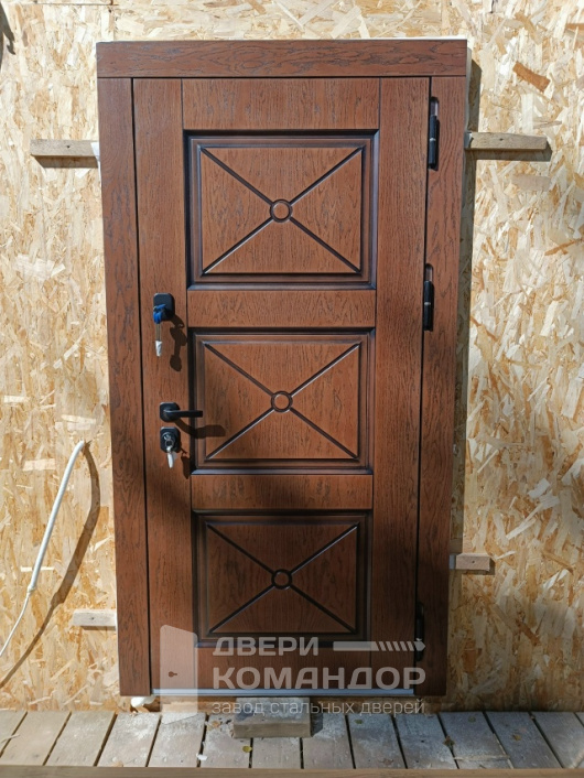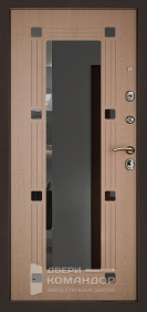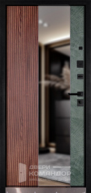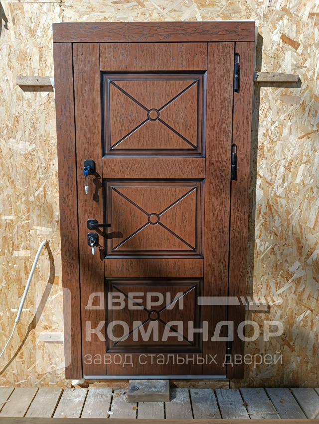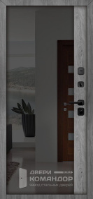 Дверь для частного дома с выходом на улицу: снаружи благородный шпон под дерево с объёмными филёнками, внутри — белая панель с высоким зеркалом-эмалью, которое добавляет света и визуально расширяет прихожую. Металл окрашен в два цвета, поэтому фасад и интерьер выглядят гармонично с обеих сторон. Терморазрыв разрывает мост холода — теплее зимой и меньше конденсата на откосах. МДФ-накладки с износостойким покрытием устойчивы к царапинам и выгоранию, легко ухаживать. Магнитные уплотнители мягко затягивают полотно без хлопка, а порог из нержавейки не боится влаги и реагентов. Надёжная запорная система с раздельными замками и аккуратной фурнитурой завершает образ.