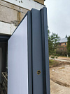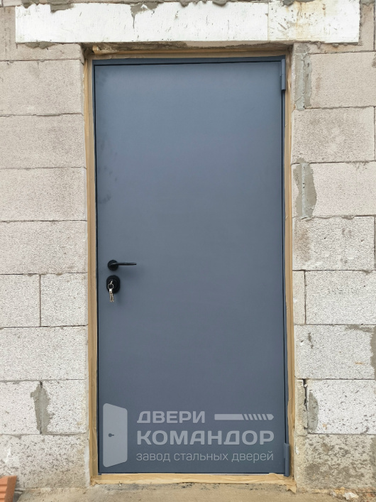 Снаружи — матовый графит, без декора и остекления: гладкая плоскость выглядит строго и не требует лишнего внимания. В итоге получаете тёплый и аккуратный вход, который не спорит с фасадом и не перетягивает на себя акценты.