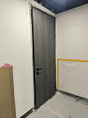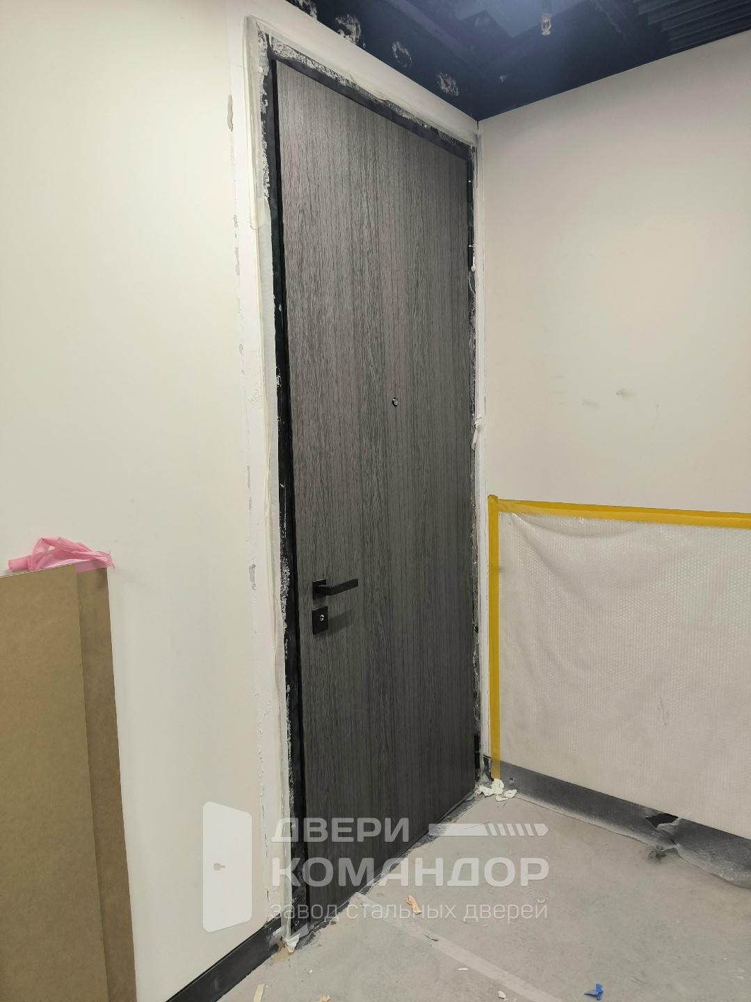 Древесная текстура добавляет тепла в серую гамму. Получается баланс между «строго» и «уютно»: дверь не выглядит холодной металлической плитой, но и не уходит в деревенский стиль.