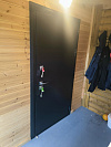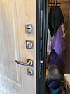 Внутри всё наоборот — и это хорошо. Светлая МДФ-панель под дерево сразу смягчает впечатление: прихожая выглядит теплее и уютнее, а дверь не кажется тяжёлой глыбой на фоне интерьера. Это тот случай, когда входная группа работает на атмосферу дома, а не забирает на себя всё внимание.