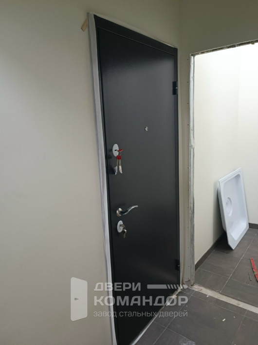 Практичная входная дверь для квартиры: снаружи — стойкое порошковое покрытие с лёгкой молотковой «шероховатостью», не ловит мелкие царапины и спокойно переносит влажную уборку в подъезде; внутри — МДФ под тёмное дерево с аккуратной фрезеровкой, которая поддержит современный интерьер без попыток «поставить точку» за вас. Ровная геометрия полотна, плотный притвор и контур уплотнения уменьшают сквозняки и бытовой шум. Разнесённая система запирания с несколькими стальными ригелями фиксирует дверь по кромке, а глазок расположен на удобной высоте — видно, кто пришёл, прежде чем открыть. Надёжный рабочий инструмент на каждый день, где снаружи — практичность, а внутри — тёплый, спокойный вид.