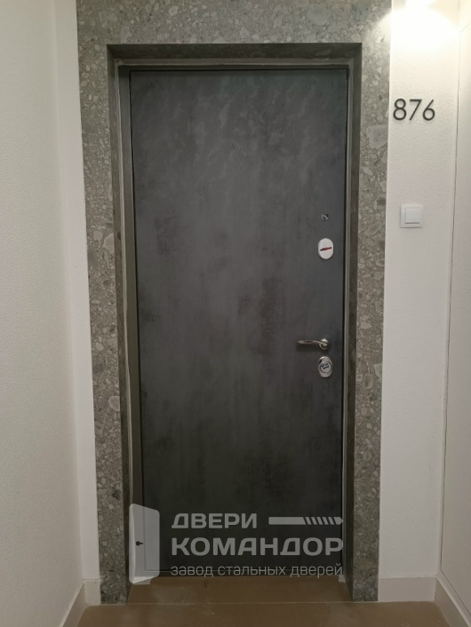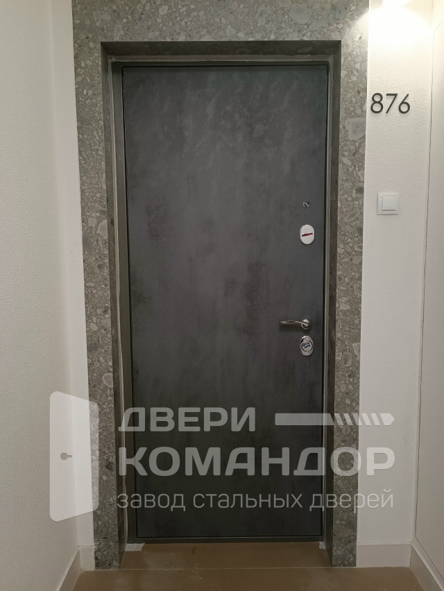 Снаружи — строгая графитовая панель под бетон: приятная матовая фактура прячет отпечатки и мелкие царапины, спокойно переживает частую уборку в подъезде. Внутри — МДФ в тёплом белом с аккуратной круговой фрезеровкой: прихожая кажется светлее, а поверхность легко отмывается от уличной пыли. Такая конфигурация уместна для квартиры: уличного ультрафиолета здесь меньше, зато важны тишина и порядок — плотный прижим полотна и эластичный контур уплотнения работают на комфорт. У входной железной двери Stardis Comfort добротная фурнитура, глазок и несколько мощных ригелей, которые фиксируют полотно по кромке и добавляют спокойствия хозяину. Холодный блеск ручки уравновешивает насыщенный серый снаружи и мягкий свет внутри — дверь выглядит современно и при этом служит практично изо дня в день.
