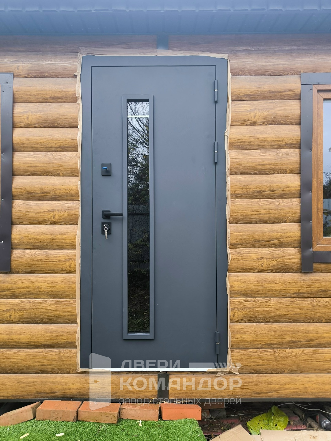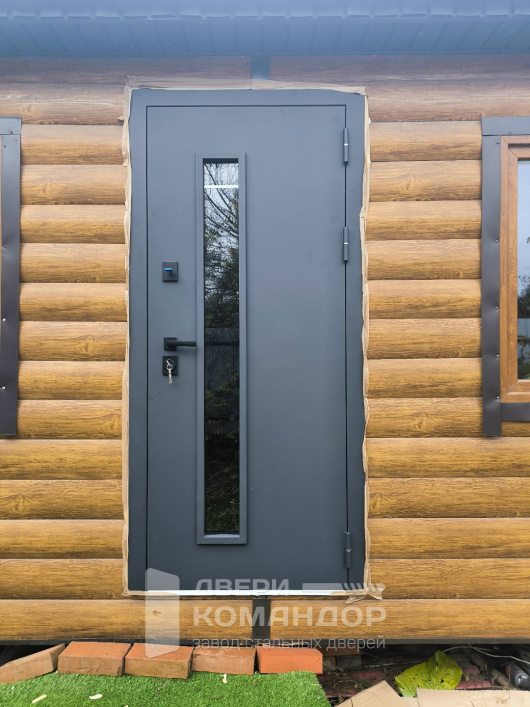 Узкое высокое остекление визуально облегчает полотно и даёт свет без ощущения витрины. Окно не спорит с фасадом, а аккуратно встраивается в геометрию двери.