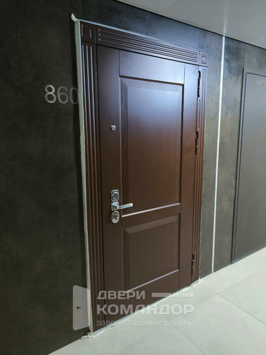Филёнчатые рамки на полотне поддерживают линии портала и дают правильную симметрию. За счёт этого дверь смотрится цельно даже в сложном подъездном освещении.