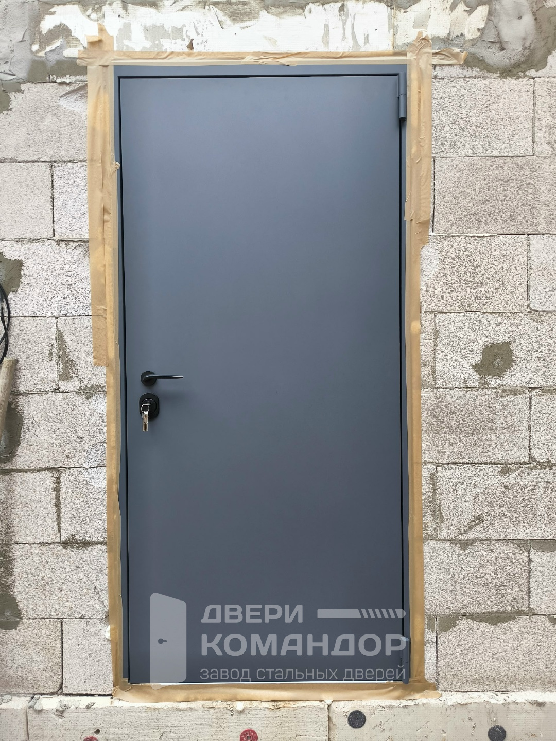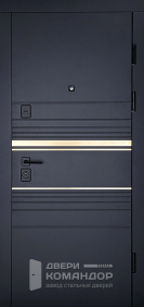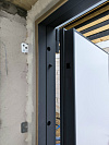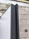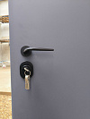 Снаружи дверь выглядит строго и спокойно: графитовая гладкая плоскость без лишнего декора. Такая отделка практична в быту: на ней не бросаются в глаза мелкие следы эксплуатации, а общий вид остаётся собранным, даже когда погода решила показать весь репертуар.